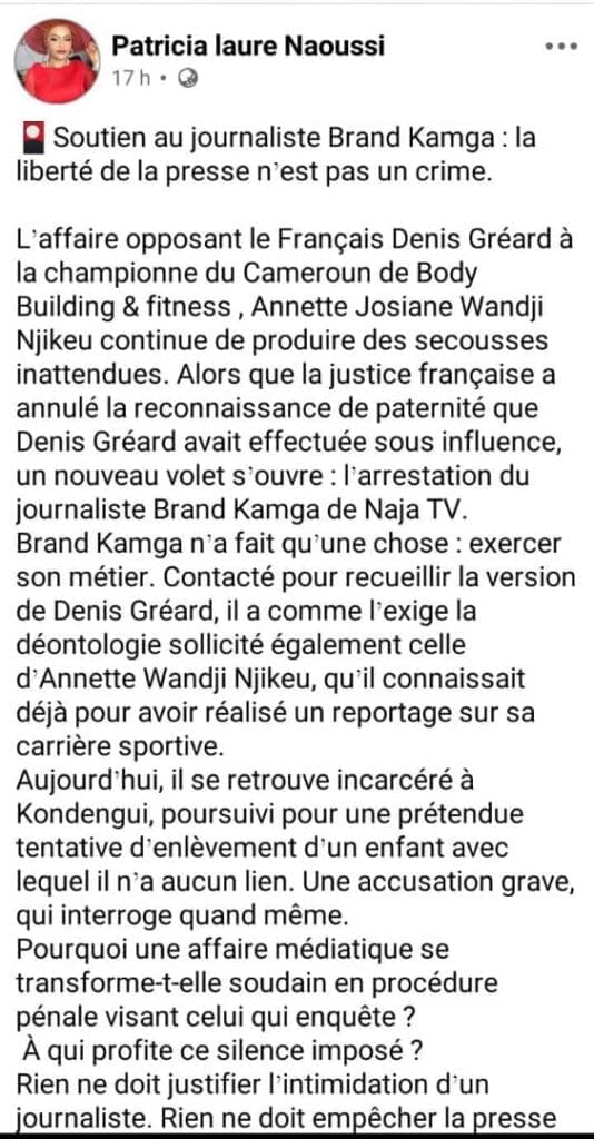 Dans quel pays ne respecte-t-on pas un journaliste ? Même s’il y avait un problème, est-ce à Kondengui qu’on devait le jeter ? Quelle procédure légale justifie un tel traitement ? Libérez-le ! »