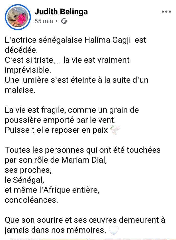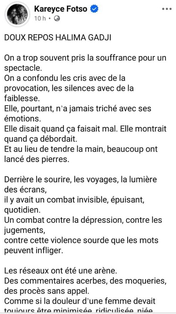 L’actrice Élisabeth Cynthia Ngono a simplement écrit : « Après tant de souffrance… Ah. » Gabriel Hervé Gwet, acteur, a posté : « Life goes on… Halima, rest in peace. »