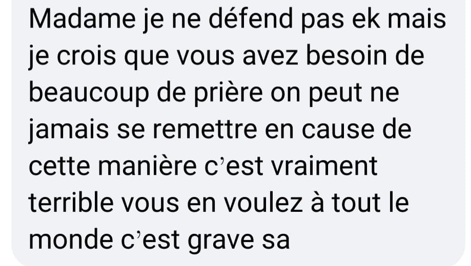 Madame je ne défend pas ek mais je crois que vous avez besoin de beaucoup de prière. On peut ne jamais se remettre en cause de cette manière c’est vraiment terrible. Vous en voulez à tout le monde, c’est grave ça «