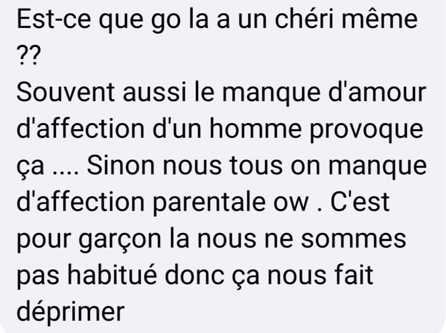 Souvent aussi le manque d’amour, d’affection d’un homme provoque ça …. Sinon, nous tous on manque d’affection parentale ow . _C’est pour garçon là nous ne sommes pas habitués, donc ça nous fait déprimer «