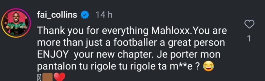 Faï Collins (international camerounais) : « Thank you for everything, you’re more than just a footballer — a great person. Enjoy your new chapter. »