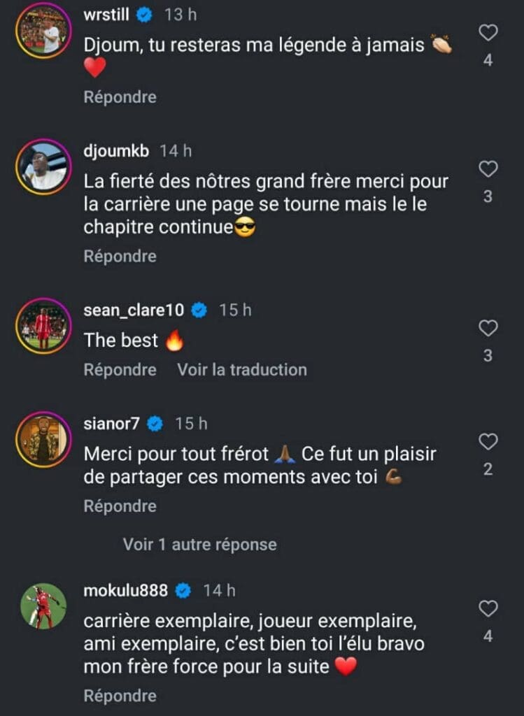 DjoumKb (son petit frère) : « La fierté des nôtres grand frère, merci pour la carrière. Une page se tourne, mais le chapitre continue.«