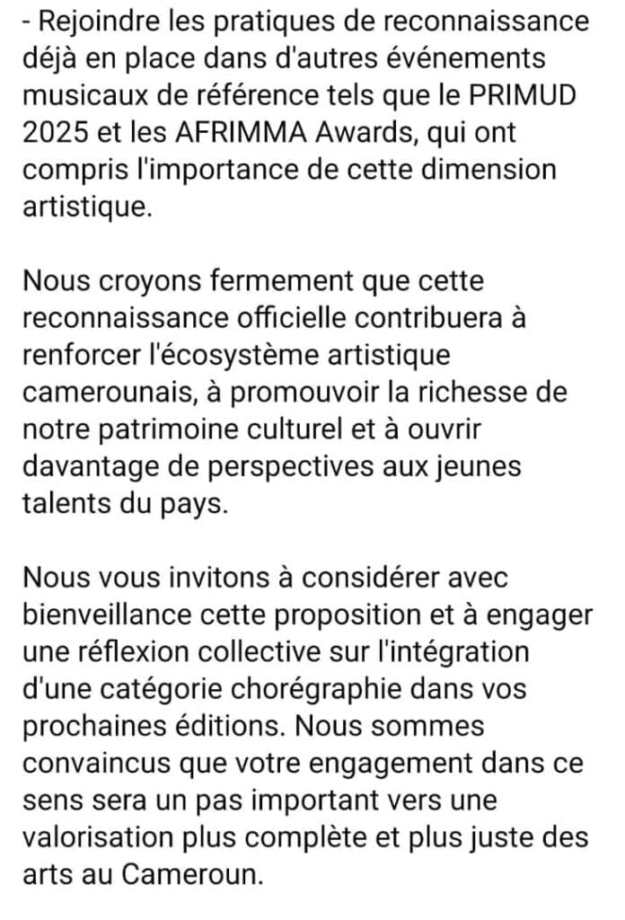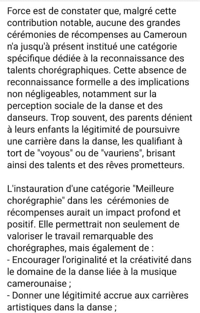 L’objet ? La création d’une catégorie dédiée à la chorégraphie dans les cérémonies de récompenses au Cameroun.