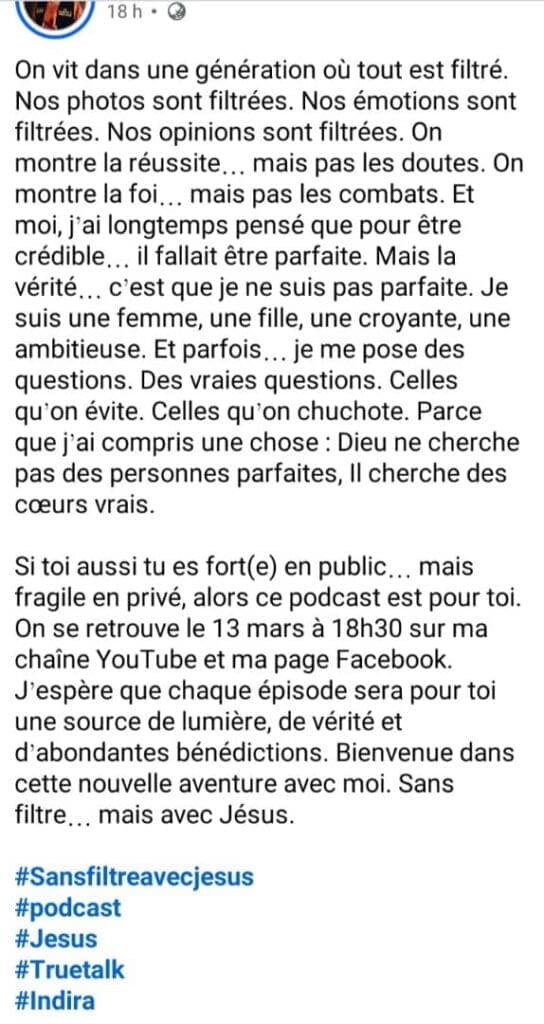 « J’ai commencé à douter de mon témoignage… Est-ce que ma rencontre avec Jésus est valable ? (…) Ma rencontre avec Jésus a été simple, silencieuse, mais surtout profonde. » C’est avec ces mots forts et vulnérables qu’Indira Baboke annonce le lancement de son tout nouveau podcast intitulé « Sans Filtre Avec Jesus » attendu le 13 mars à 18h30 sur sa chaîne YouTube et sa page Facebook. Un projet personnel, spirituel et assumé, qui intervient dans un contexte où la jeune femme fait également face à des rumeurs persistantes sur les réseaux sociaux.