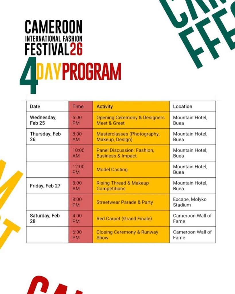 Du 26 au 28 février 2026, Buea se transforme en capitale africaine de la mode avec l’édition 2026 du Cameroon International Fashion Festival (CAMIFFEST). Placé sous le thème « La mode pour une Afrique durable », le festival réunit créateurs, designers, mannequins, entrepreneurs, artistes et décideurs politiques autour d’une vision commune : promouvoir la créativité africaine tout en valorisant un secteur responsable et durable.
