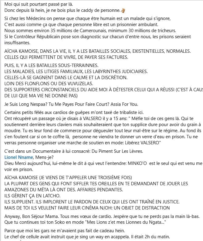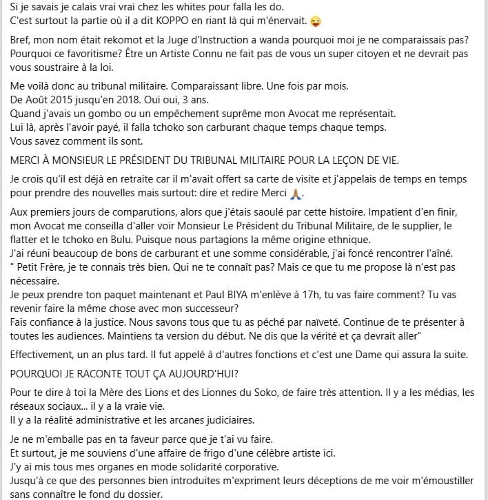 L’artiste revient également sur les réactions en ligne autour de certaines affaires publiques, dénonçant ce qu’il considère comme une forme d’hypocrisie sociale : « Si chez les médecins on pense que chaque être humain est un malade qui s’ignore… chaque personne libre est un prisonnier ambulant. » Et conclut sur une critique du comportement collectif : « Nous sommes environ 35 millions de Camerounais, minimum 30 millions de tricheurs. »