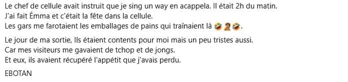Dans une tonalité à la fois fraternelle et directe, Koppo termine sa lettre en appelant à la retenue et à la discrétion dans les affaires judiciaires : « Les batailles sous-terraines se gagnent dans le calme et la discrétion. Loin des flonflons ou des vuvuzelas. » Et conclut avec une pointe d’humour fidèle à son style : « Parce que moi les gars ne m’avaient pas fait de cadeau hein… J’ai fait Émma et c’était la fête dans la cellule. »