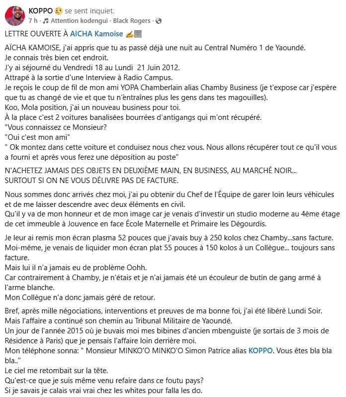 Dans une longue lettre ouverte largement relayée sur les réseaux sociaux ce mercredi 22 avril 2026, l’artiste camerounais Koppo s’adresse à Aïcha Kamoise, actuellement au cœur de l’actualité judiciaire. Entre témoignage personnel, récit carcéral et mise en garde, l’auteur plonge dans ses propres démêlés avec la justice pour inviter à la prudence face aux jugements publics. Dès l’ouverture, le ton est donné. Koppo écrit avec franchise : « Aïcha Kamoise, j’ai appris que tu as passé déjà une nuit au Central Numéro 1 de Yaoundé. Je connais très bien cet endroit. »