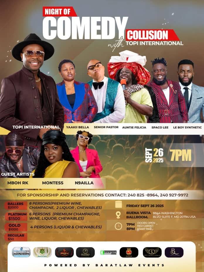 Ce vendredi, l’humour et la musique se rencontrent au Buena Vista Ballroom pour la Night of Comedy Collision avec les comédiens camerounais comme Topi International, Senior Pastor, Auntie Felicia. La soirée sera également animée par les artistes Montess et N9ailla.
