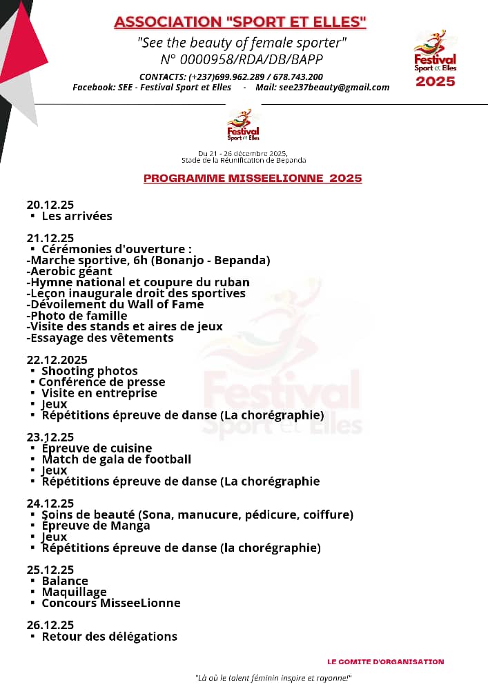 Le concours conserve sa place dans la programmation. « Misseelionne sacre la sportive camerounaise et africaine. Cette année, nous intégrons Misseeparalionne afin de prendre en compte les sportives handicapées. Elles participent aux Jeux paralympiques, remportent des médailles pour le Cameroun et doivent être reconnues. »