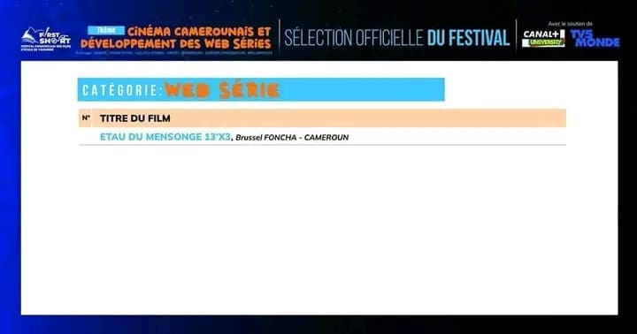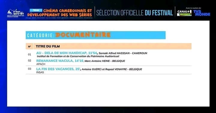 La sélection couvre plusieurs catégories : fiction, documentaire, espoir et web série, avec des œuvres venues du Cameroun, de Belgique, du Canada, du Brésil et d’Égypte.