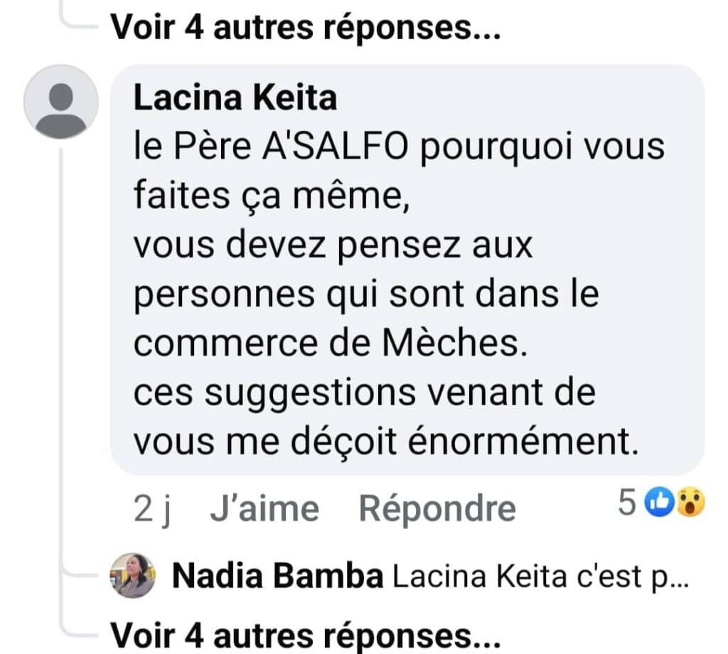 « Le père A’Salfo, pourquoi vous faites ça même? Vous devez penser aux personnes qui sont dans le commerce de mèches. Cette suggestion venant de vous me déçoit énormément.«
