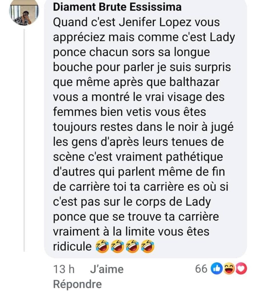 « Quand Lady voudrait que vous parliez d’elle, elle se met alors à votre niveau. Elle a fait exprès de s’habiller ainsi « , « Quand c’est Jennifer Lopez vous appréciez mais comme c’est Lady Ponce chacun sort sa bouche pour parler« , soutiennent- t-ils.