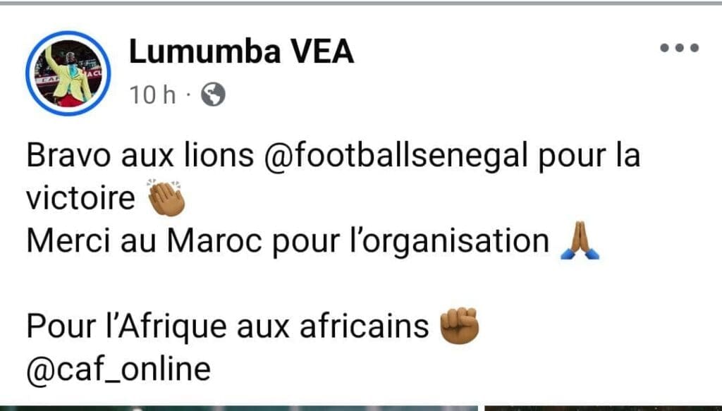 Lumumba VEA, le célèbre supporter congolais a remercié le Maroc pour l’organisation, tout en félicitant le Sénégal pour la victoire.