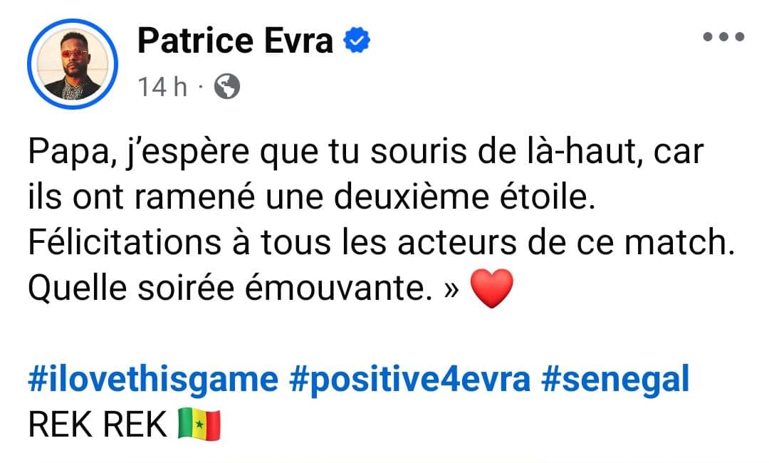 Le Franco-sénégalais Patrice Evra, ancien capitaine des Bleus, resté viscéralement attaché à ses racines, a ému la toile. « Papa, j’espère que tu souris de là-haut… Quelle soirée émouvante », a-t-il posté, soulignant le poids symbolique de cette deuxième étoile.