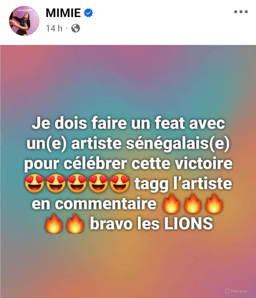 MIMIE, la star de la pop camerounaise a transformé sa joie en projet artistique. Elle a lancé un appel à ses fans pour choisir un artiste sénégalais avec qui réaliser un « feat » historique pour célébrer cette victoire.