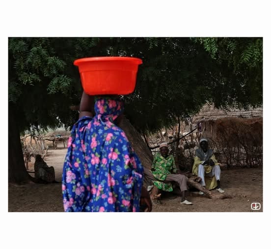 « Ici chez nous, les femmes habitent l’élément hydrique comme un refuge. On voit clairement des hommes posés sous un arbre, oisifs, et cette femme, en flou, dans toute sa puissance, portant l’eau comme un fardeau. NDIYAM, parce que l’eau c’est la vie. »