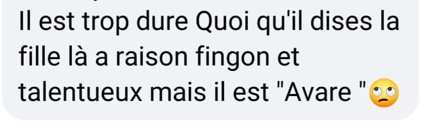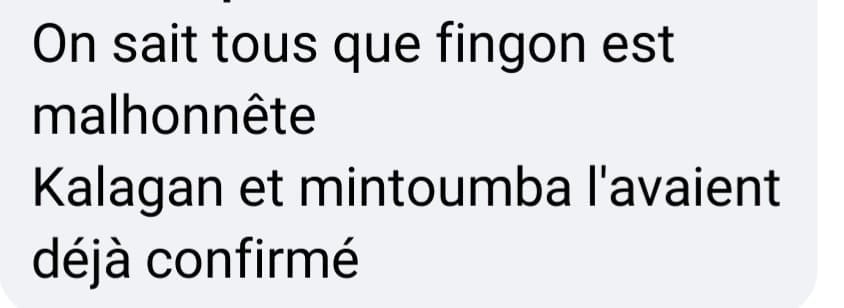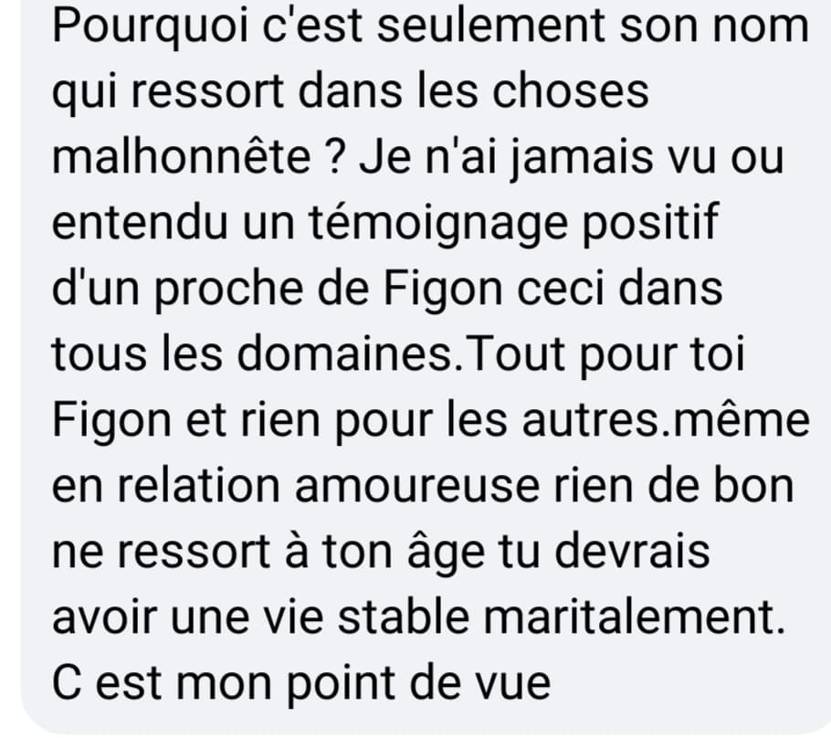 « Pourquoi c’est seulement son nom qui ressort dans les choses malhonnêtes ? Je n’ai jamais vu ou entendu un témoignage positif d’un proche de Fingon, ceci dans tous les domaines. Tout pour toi Fingon et rien pour les autres. Même en relation amoureuse, rien de bon ne ressort. À ton âge, tu devrais avoir une vie stable maritalement. C’est mon point de vue«