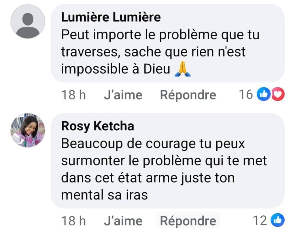« Peu importe le problème que tu traverses, sache que rien n’est impossible à Dieu», « Beaucoup de courage. Tu peux surmonter le problème qui te met dans cet état. Arme juste ton mental et tu verras », « Ton message est très inquiétant», peut-on lire dans les commentaires.