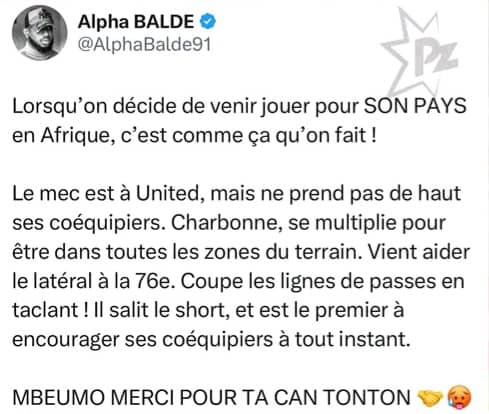 « Mbeumo joue pour son pays avec humilité et engagement. Il est partout sur le terrain, aide ses coéquipiers et contribue directement aux buts, notamment ceux de Kofane. Merci pour ta CAN, Tonton ! »