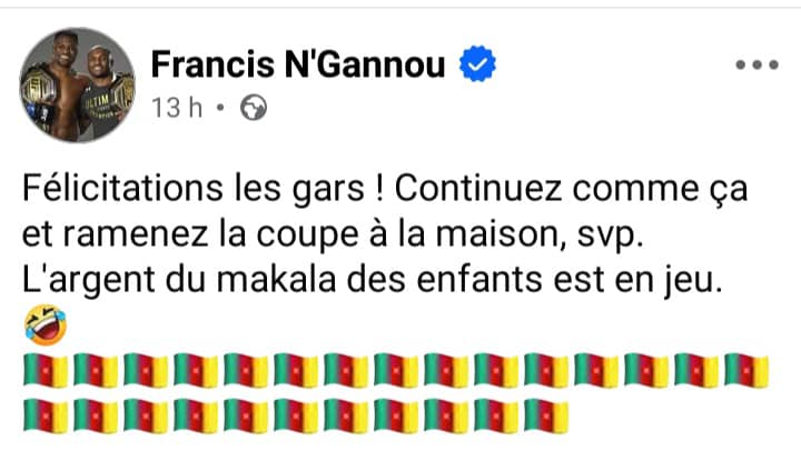 Enfin, Francis Ngannou, dans un ton plus humoristique, a ajouté : « Félicitations les gars ! Continuez comme ça et ramenez la coupe à la maison. L’argent du makala des enfants est en jeu ! »