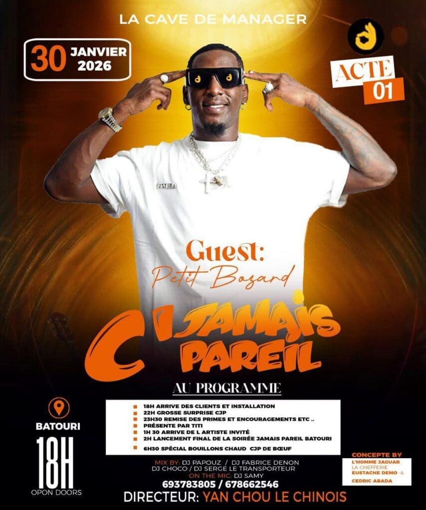 La ville de Batouri s’apprête à vibrer au rythme de l’un des artistes les plus populaires du moment. Ce vendredi 30 janvier, Petit Bozard est la tête d’affiche de l’événement « C Jamais Pareil » à la Cave de Manager. Ce showcase très attendu par les fans de la région de l’Est promet une ambiance électrique et une performance en direct qui marquera les esprits des noctambules de la localité.
