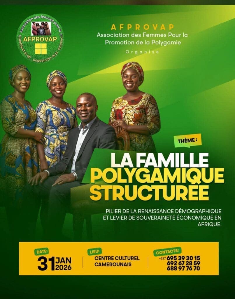 Le samedi 31 janvier à 10h00, le Centre Culturel Camerounais servira de cadre à une réflexion sociétale organisée par l’AFPROVAP (Association des femmes pour la promotion de la polygamie). La conférence portera sur la thématique de la famille polygamique structurée, abordée comme un pilier de la renaissance démographique et un levier économique. Cette rencontre vise à ouvrir le débat sur les structures familiales traditionnelles face aux enjeux contemporains du développement.