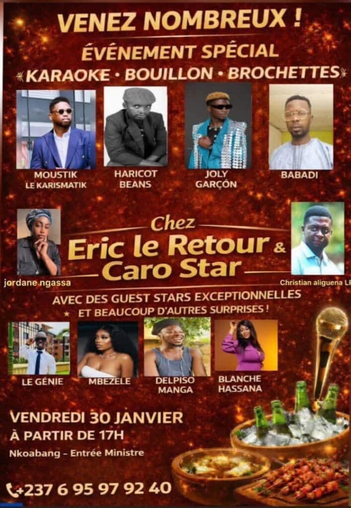 Du côté de Nkoabang, l’effervescence commence dès ce vendredi après-midi à 17h00. Le complexe Eric le Retour & Caro Star reçoit les icônes de l’humour Moustik le Karismatik et Haricot Beans pour une soirée spéciale. Entre les séances de karaoké, les dégustations de braises et les fous rires, le public vivra un moment de proximité unique avec ces stars de la scène humoristique camerounaise.