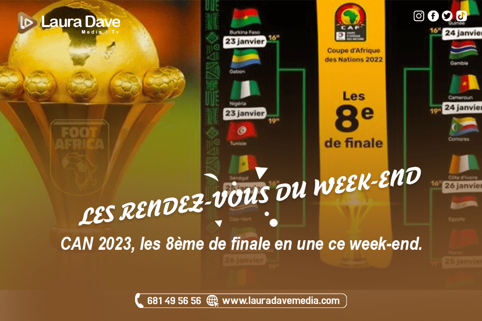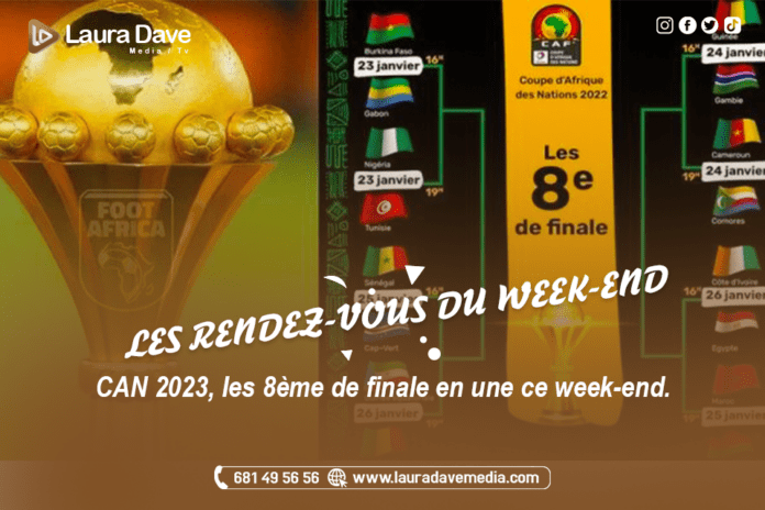 Les passionnés de sport et particulièrement du football seront à l’honneur une fois de plus ce weekend à l’occasion des 8ème de finale de la 34ème édition de la CAN TotalEnergies Côte d’Ivoire 2023 qui démarrent ce samedi 27 janvier 2024. À côté de cette actualité majeure, soirée culturelle, exposition d’art et projection cinématographique seront l’essentiel des activités de ce dernier week-end du mois de Janvier 2024.