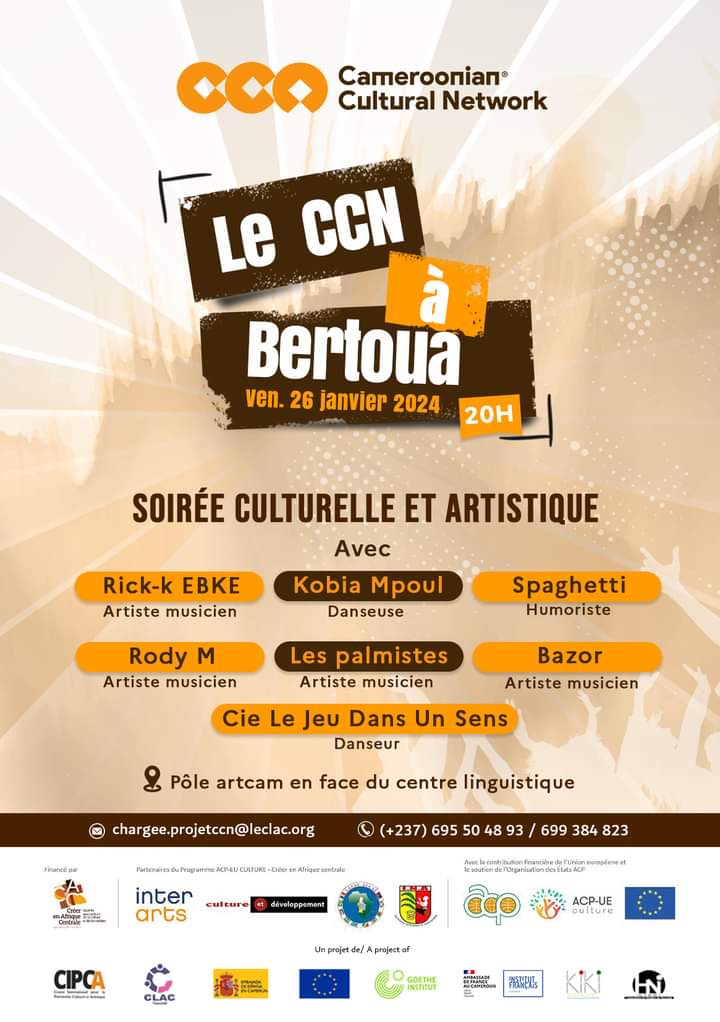 La Cameroonian Cultural Network organise une soirée culturelle et artistique ce vendredi 26 janvier 2024 du côté de Bertoua. Entre musique, humour et danse, des artistes à l’instar de Rick-K Ebke, Rody M, Spaghetti et Kobia Mpoul entre autres seront de la partie dès 20h00 pour rendre cet événement unique en son genre.