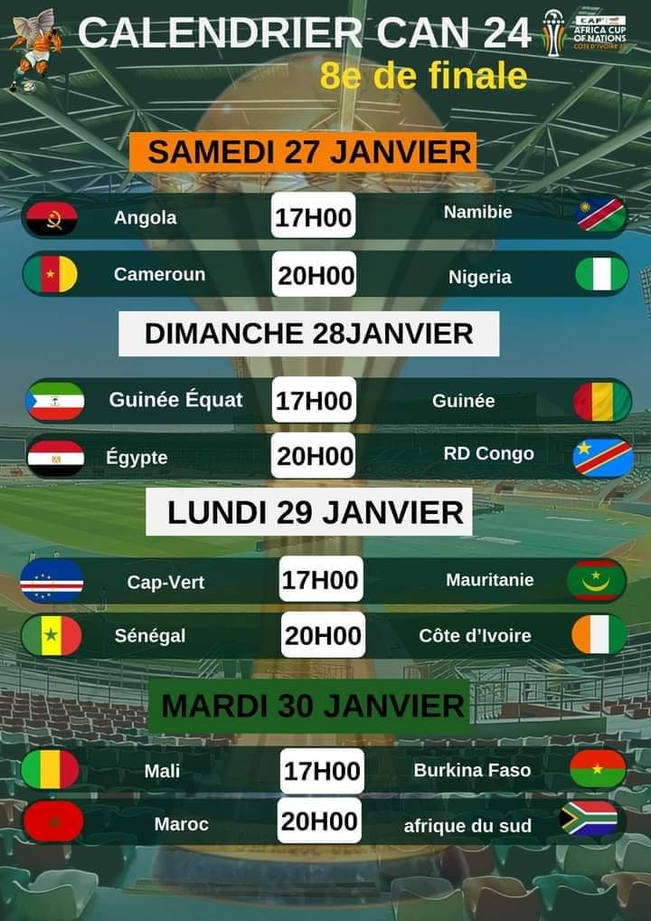 La pelouse du stade Félix Houphouët-Boigny en Côte d’Ivoire sera l’espace adéquat qui accueillera l’une des premières affiches des 8ème de finale de la CAN 2023 ce samedi 27 janvier 2024. À 21h00, les Lions Indomptables du Cameroun croiseront le fer avec les Super Eagles du Nigeria. Avant ce duel qui s’annonce électrique, l’Angola devra défier la Namibie au stade de la paix à Bouaké lorsqu’il sera 18h00. Dimanche 28 janvier 2024, la Guinée Équatoriale sera face à la Guinée Conakry au stade D’Ebimpé à 18h00. Autour de 21h00, les pharaons d’Egypte livreront une rencontre face aux léopards de la RD Congo au stade Laurent Pokou.