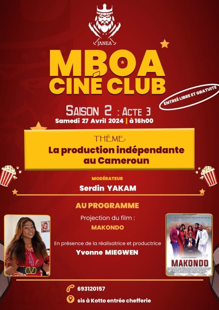 Du côté de Kotto ce samedi 27 dès 17h00, le promoteur culturel Serdin Yakam et son équipe offrirons aux amoureux du 7 ème art, l’Act 3 du concept Mboa Ciné. L’actrice, réalisatrice et productrice de cinéma Yvonne Miegwen partagera ses astuces sur la production indépendante en milieu camerounais. Avant les échanges, une projection du long-métrage »Makondo » sera diffusé pour le plus grand bonheur des spectateurs.