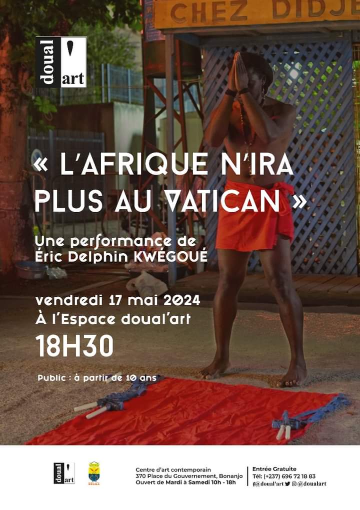 En ouverture de ces rendez-vous du week-end, la galerie d’art contemporain Doual’art à travers le performeur Éric Delphine Kwegoue livrera ce vendredi 17 mai 2024 à 18h30 une performance artistique intitulée »L’AFRIQUE N’IRA PLUS AU VATICAN ». Le but de ce moment est de libérer le corps africain de l’héritage de l’esclavage, de la colonisation et des doctrines étrangères, tout en le ramenant à sa source première qu’est la tradition de ses propres ancêtres.