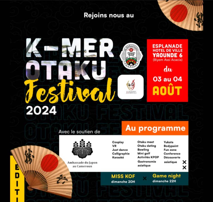 Le K-mer Otaku Festival est un important événement en Afrique centrale qui fait la promotion du manga, de l’animation et du jeu vidéo en passant par la pop culture asiatique. Pour cette édition, les organisateurs vous invitent les samedis 3 et dimanche 4 août à l’esplanade de l’hôtel de ville de Yaoundé 6 ( Biyem Assia acacia) pour vivre un moment unique chargé d’activités interactives pour rendre votre expérience inoubliable. Au programme, cosplay, karaoké, calligraphie, Otaku meet, mini-golf, gastronomie asiatique et bien d’autres.
