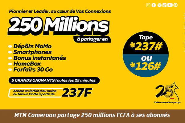 MTN Cameroon, opérateur leader et pionnier de la téléphonie, fidèle à sa mission de connecter les Camerounais à ce qui compte pour eux, met en jeu une cagnotte exceptionnelle de 250 000 000 FCFA, à travers plusieurs tirages organisés tout au long de la campagne.