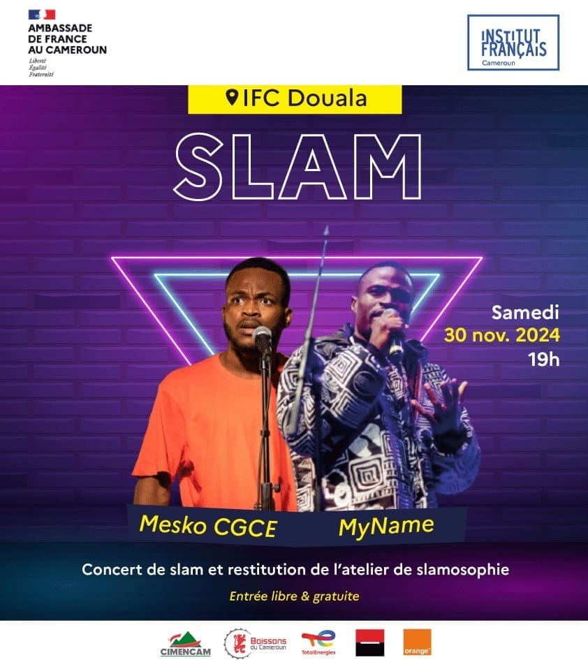 L’Institut Français de Douala te propose également ce même 30 novembre, une immersion dans l’univers du slam avec l’atelier « Slamosophie ». À partir de 19h00, l’institut offrira aux jeunes un espace d’expression unique, alliant poésie, slam et réflexion philosophique. Avec Myname le Slamaster, créateur du concept innovant de Slamosophie, cet événement invitera les participants à explorer leur société et leur rôle dans le développement de leur pays, à travers la création et la présentation de leurs textes. La soirée sera enrichie par la présence de Mesko – CGCE, artiste engagé et champion du Slam Togo-2018, qui partagera son art et ses valeurs.