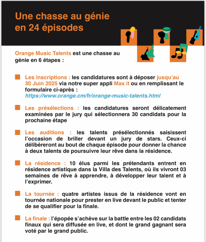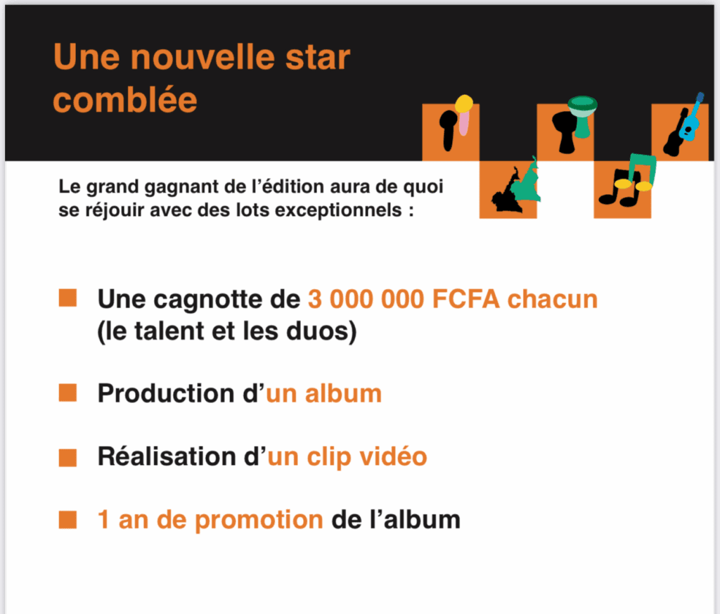 Aujourd’hui, la marque revient avec le programme « Orange Music Talents » ! C’est une compétition initiée à la base par le groupe Orange et adaptée par les filiales comme ici au Cameroun, afin de révéler les jeunes talents musicaux locaux. Cette plateforme est destinée à offrir aux artistes en herbe une opportunité qui leur permettra de révéler leur talent, de vivre leur passion et de devenir les prochaines stars de la musique camerounaise.