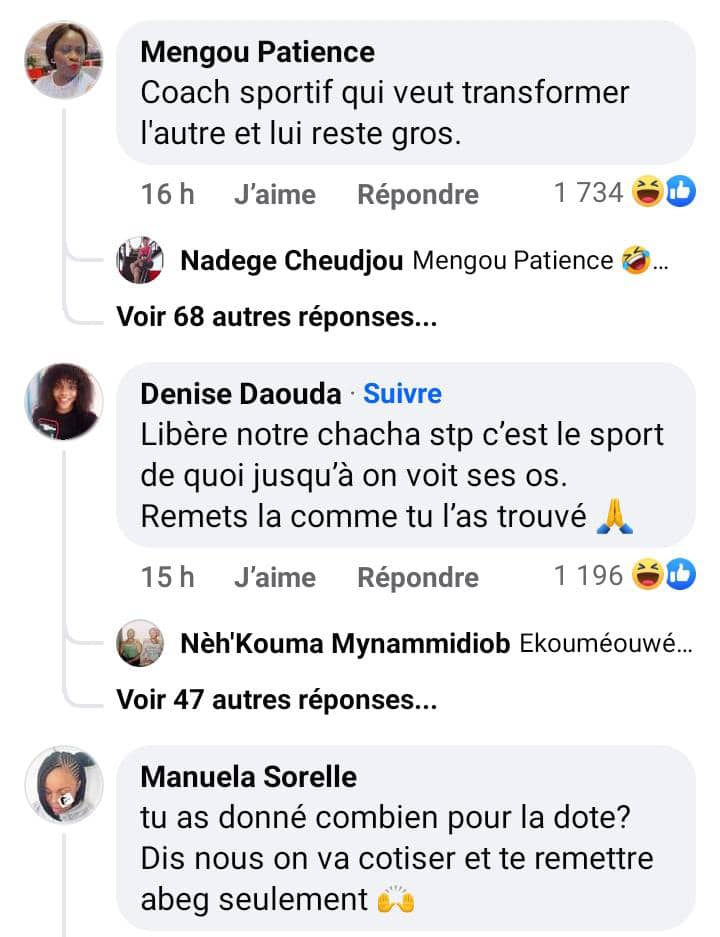 »Vous faites le sport tous les deux. Elle perd le poids et toi, tu prends le poids », »remets-là comme elle était, après, on va lancer la cagnotte pour te rembourser ta dote », ou encore » Fernando Lopez, tu as détruit notre star », »Jusqu’à Chacha parlait avec la voix d’un homme l’autre soir à la télé… Toute sa douceur est entrain de se diluer dans ton MMA », peut-on lire.