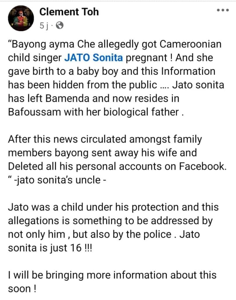 « Bayong Ayma Che aurait mis enceinte la jeune chanteuse camerounaise Jato Sonita ! Elle a donné naissance à un petit garçon, et cette information a été cachée au public… Jato Sonita a quitté Bamenda et réside désormais à Bafoussam avec son père biologique. Après que cette nouvelle ait circulé parmi les membres de sa famille, Bayong a renvoyé sa femme et supprimé tous ses comptes personnels sur Facebook« , avait-on pu lire sur la page de Clément Toh.