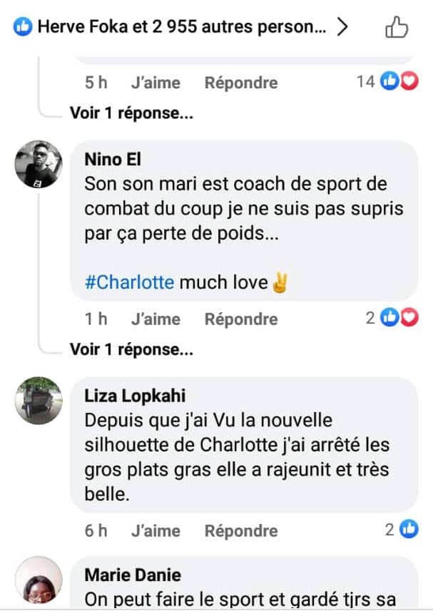 « Le poids n’est pas bien, je la préfère comme ça », « j’aime ton poids ma star trop belle « , « j’adore plutôt son nouveau poids elle a rajeuni « , « son mari est coach de sport de combat, du coup je ne suis pas surpris par sa perte de poids… », « depuis que j’ai vu la nouvelle silhouette de Charlotte, j’ai arrêté avec les gros plats gras. Elle a rajeuni et est très belle », « J’ai vu des vidéos où elle faisait du sport !!! Elle a plutôt rajeuni et c’est cooool », peut-on lire sous la vidéo postée par l’artiste Sabrina Love.