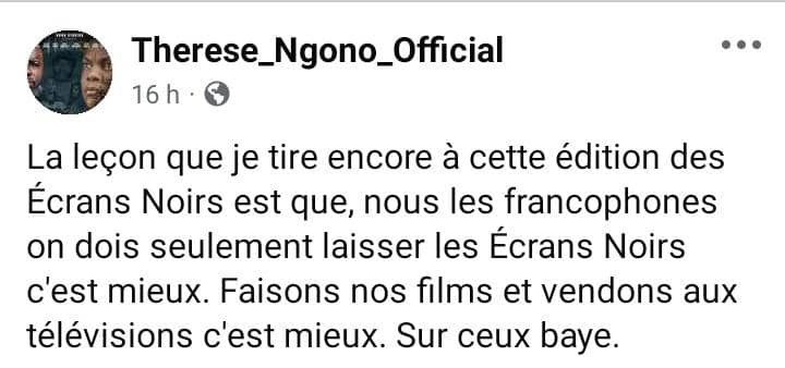 Plusieurs autres acteurs à l’instar de Thérèse Ngono sont montés au créneau pour exprimer leur désarroi suite à la nomination du défunt Otia Vitalis comme meilleur acteur camerounais de sexe masculin et, à la multitude des prix glanés par les acteurs du 7e art venus des régions anglophone du Cameroun. La figure de proue du long-métrage « L’Accord » de Thierry Léa Mallè affirme : » La leçon que je tire encore à cette édition des Écrans Noirs est que, nous les francophones, on doit seulement laisser les Écrans Noirs. Faisons nos films et vendons aux télévisions c’est mieux… ».