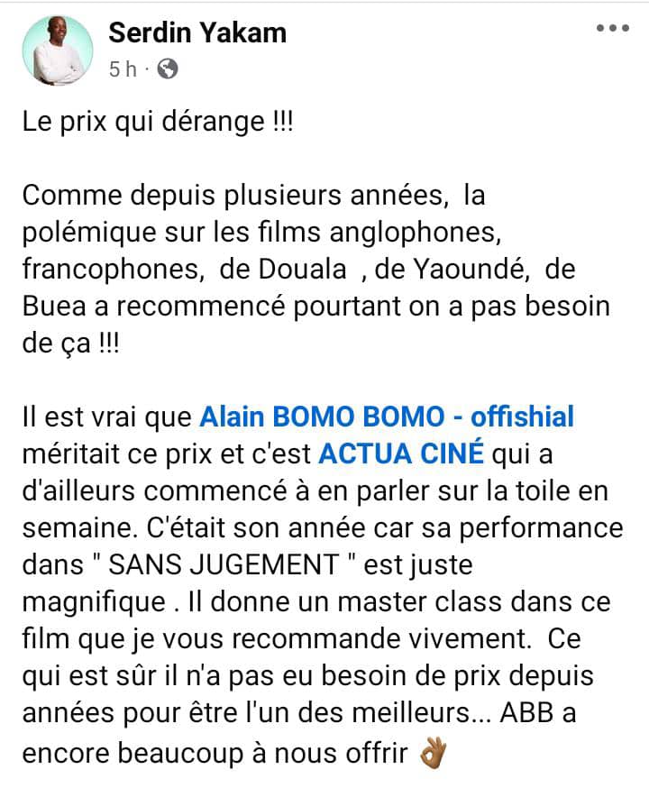 »Alain Bomo Bomo méritait ce prix…c’était son année car sa performance dans »Sans jugement » est juste magnifique » , affirme le blogueur de cinéma Serdin Yakam dans une publication sur la toile. L’acteur Joël Patrick Oyono lui, dit être »Dégouté » par les résultats de cette édition. Pour le graphiste et acteur Mani Fabrice, la politique aurait tué la transparence et la vérité au sein du jury de ce festival créé en 1996 par Basseck Ba Kohbio : »Écrans noirs / écrans ténébreux ! Vraiment dans le noir !!! Alain Bomo Bomo est le meilleur acteur de l’année pour nous ! La politique tue l’art ! Pfff! » a-t-il écrit, tout en invitant le public à aller découvrir la hauteur du talent qu’a déployé Bomo Bomo dans le long-métrage « Sans Jugement » lors de la grande première.