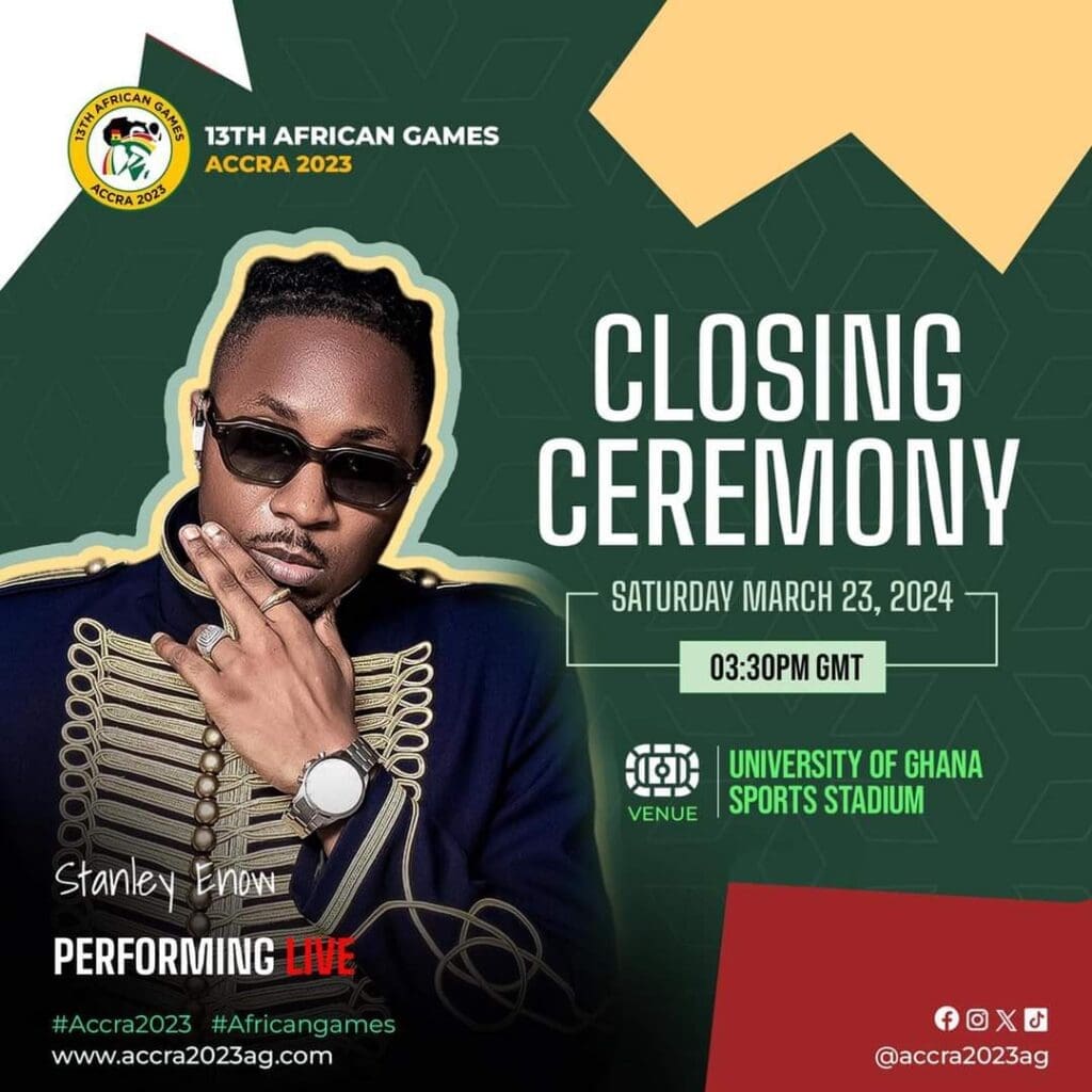Unique artiste camerounais invité à la clôture de la 13 édition des Jeux Africains à Accra au Ghana, Stanley Enow a enflammé les spectateurs avec sa prestation sensationnelle. Entre le rythme, la danse, et la production scénique, il a ébloui des centaines de milliers de personnes réunis au stade de l’université des Sports d’Accra, leur offrant un aperçu de la richesse et de la diversité culturelle du Cameroun et du continent africain. Sa performance lui a d’ailleurs valu une reconnaissance spéciale du ministre de la jeunesse et des sports du Ghana, Mustapha Ussif.