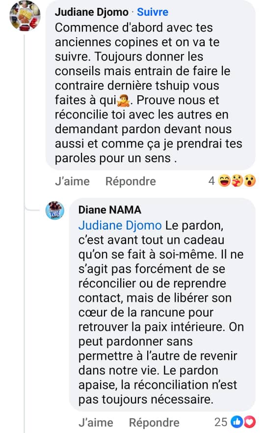 Diane Nama plaide pour un pardon intérieur, sans obligation de renouer les liens rompus. Dans un univers où les ruptures publiques sont scrutées, elle choisit la paix intérieure plutôt que les excuses spectaculaires. Ne vous attendez donc pas à revoir Diane Nama et ses anciens amis du showbiz ensemble.