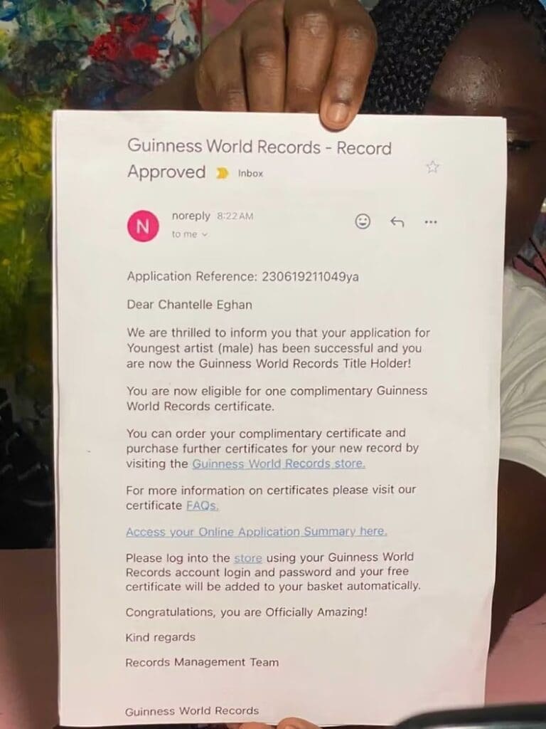 Après avoir présenté sa candidature en décembre dernier, c’est finalement ce mardi 14 mai 2024 lors d’une conférence de presse que Ace Liam et sa famille ont été notifiés du choix porté sur la candidature du petit ghanéen pour le titre du plus jeune artiste (masculin) du monde et qu’il »…est désormais détenteur du titre Guinness records », comme le confirme cette capture d’écran 👇🏾