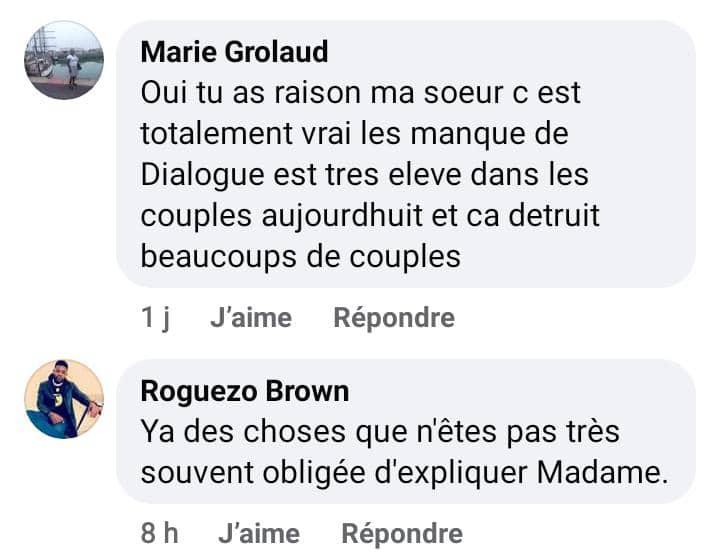 La vidéo qui dure près de 5 minutes a généré plus de 3000 likes, 120 partages et des centaines de commentaires mitigés. Certains internautes étaient d’accord avec la comédienne : « Oui tu as raison ma sœur. C’est totalement vrai. Le manque de dialogue est très élevé dans les couples aujourd’hui et ça détruit beaucoup de couples », « La mère tu trahis alors maintenant notre Secret comment non ? »
