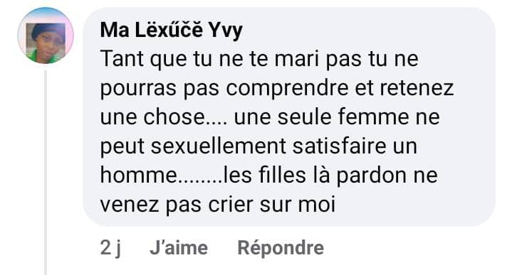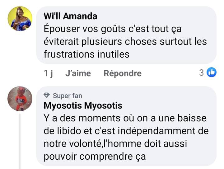 Et de poursuivre : « Si ta tête n’est pas dans le rapport sexuel, tu sèches. Il y a des femmes qui se refusent à leur mari, ils disent qu’elles boudent. Non ! Elles ne boudent pas. C’est ton corps qui pose problème. »