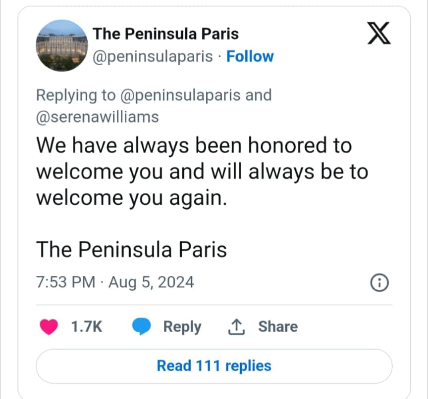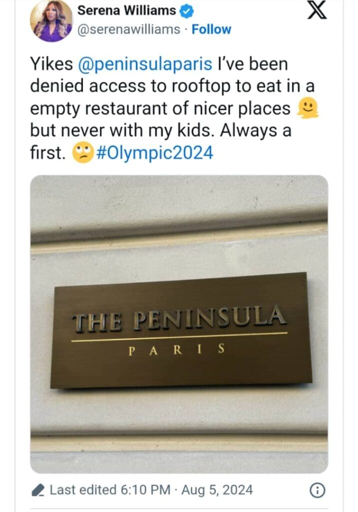Dans son message, Williams a exprimé son étonnement face à cette situation inhabituelle : «Incroyable! Peninsula Paris, on m’a refusée l’accès au rooftop pour manger, dans un restaurant vide… Toujours une première », a-t-elle écrit sur son compte X.