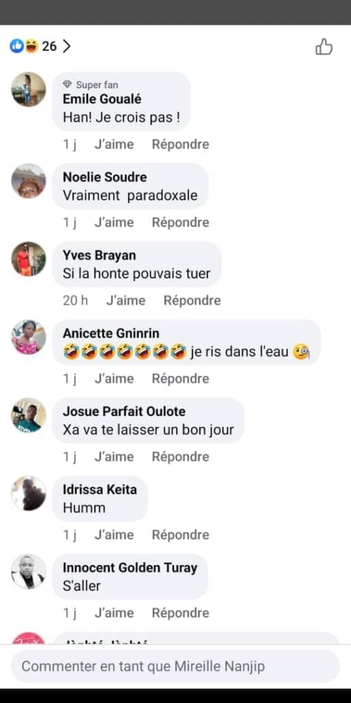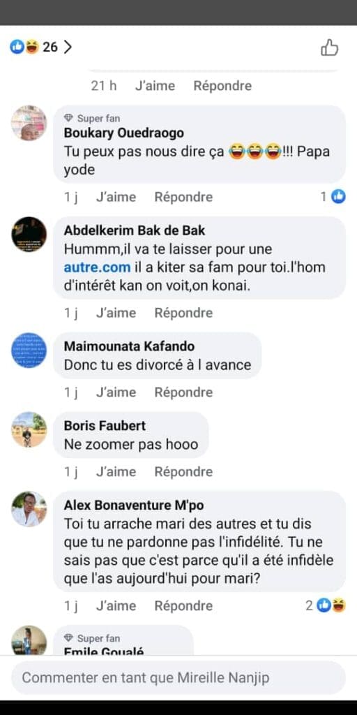 Une réponse claire et nette qui n’a pas tardé à enflammer les réseaux sociaux. De nombreux internautes ont immédiatement réagi, certains rappelant des éléments de la vie personnelle de l’artiste. Les commentaires, acerbes parfois, n’ont pas manqué : « C’est grâce à l’infidélité que tu es là, ma chère» ou encore « S’il n’avait pas été infidèle, est-ce que tu serais aujourd’hui avec lui ? ». Ces remarques visent notamment sa relation avec l’ex-footballeur international Serey Dié, avec qui elle a deux enfants.