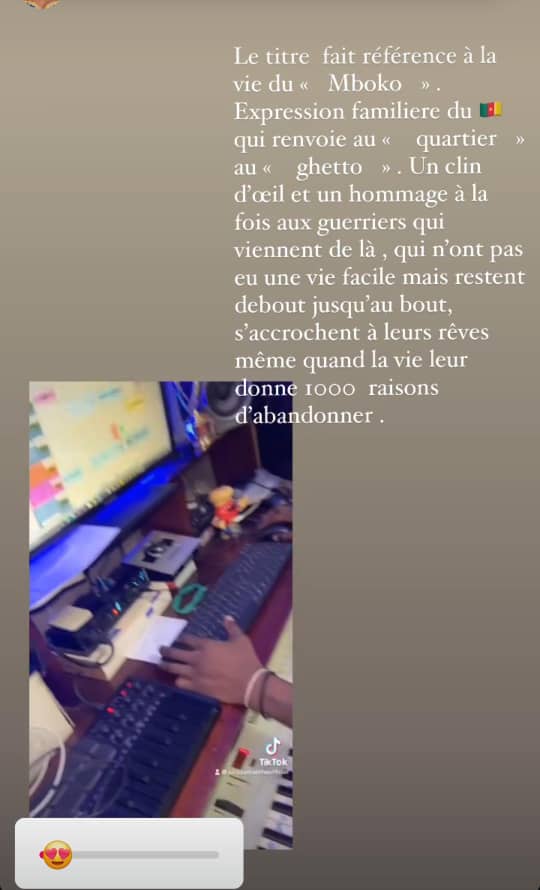 « Le titre fait référence à la vie du « mboko », argot camerounais qui renvoie au « ghetto » ou à la rue. Un clin d’œil et un hommage à la fois aux guerriers qui viennent de là, qui n’ont pas eu une vie facile mais restent debout jusqu’au bout, s’accrochent à leurs rêves même lorsque la vie leur donne 1000 raisons d’abandonner« , a expliqué Samantha sur Instagram.